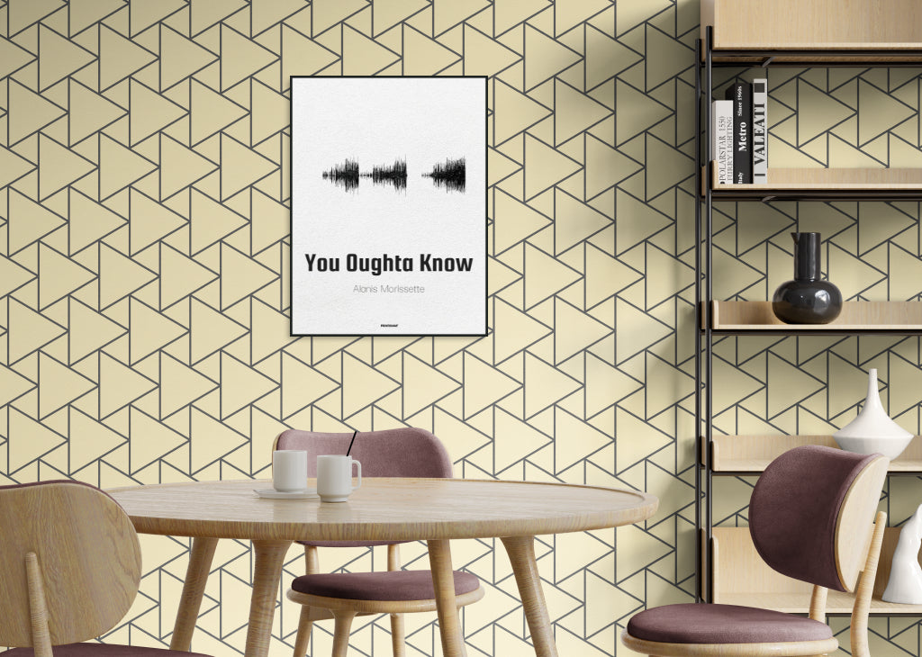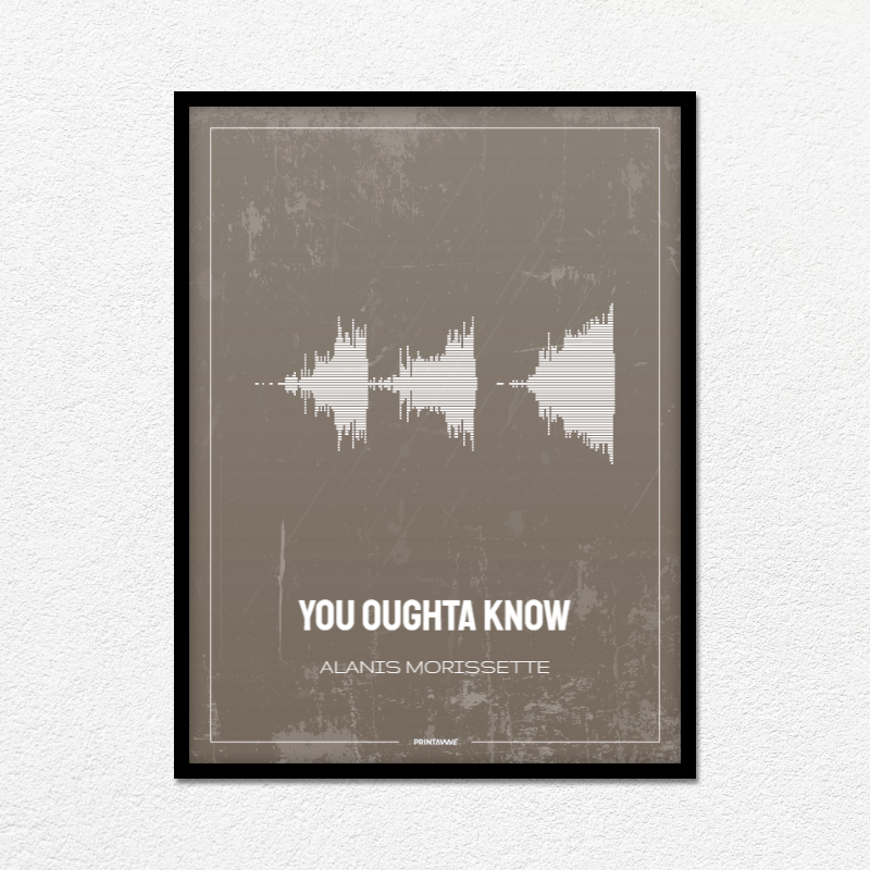 Evoking the raw and turbulent emotions of a generation, Alanis Morissette's "You Oughta Know" is vividly captured in this soundwave poster. Notably the first hit from her breakout album, this track's intense lyrics and iconic alt-rock sound are beautifully represented, making a perfect piece for any Alanis devotee.