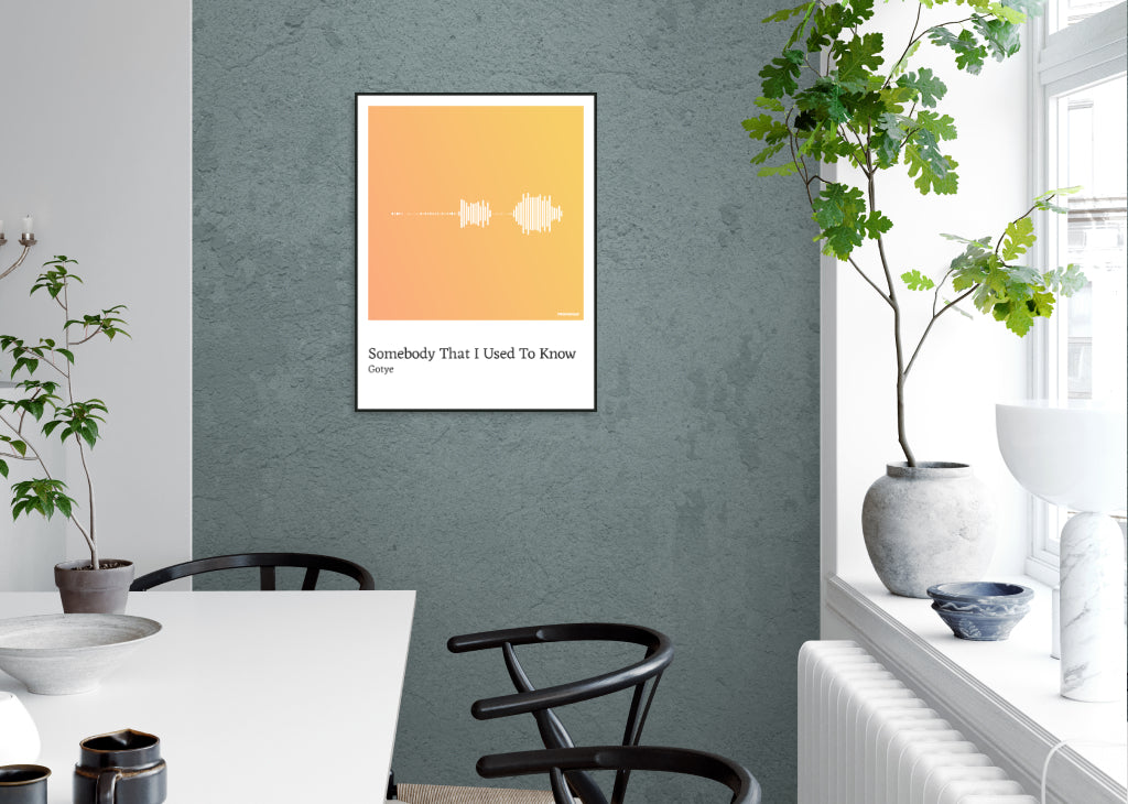 Encapsulating the haunting melody of Gotye's "Somebody That I Used To Know", this soundwave poster visually represents the song's unique xylophone riff. Known for its catchy tune and heartbreakingly relatable lyrics, this poster is a must-have for fans of this unforgettable track.